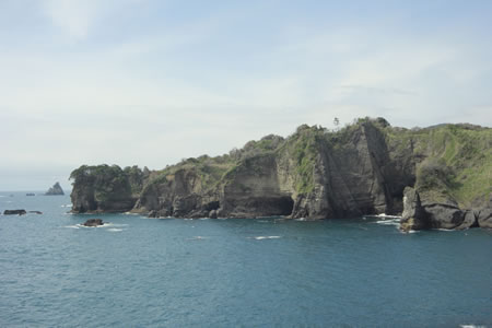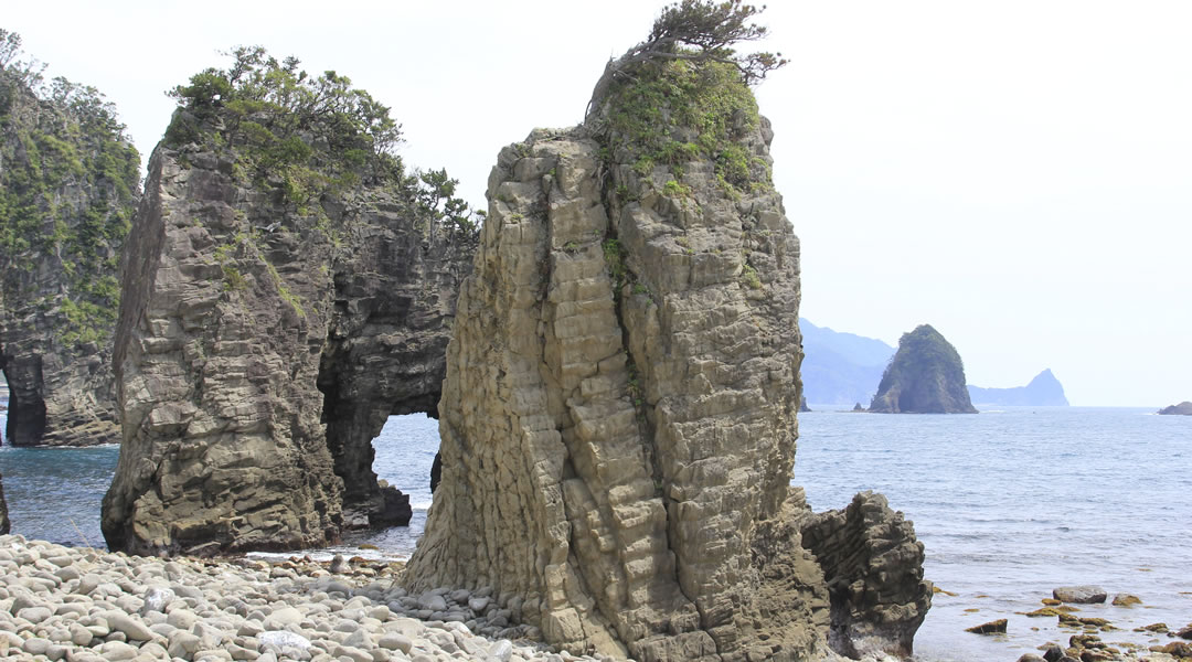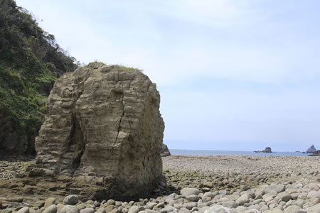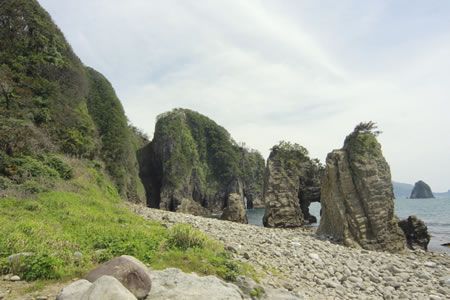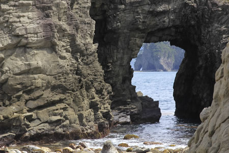 浮島海岸に出ると、海水浴場の横におもしろい地形が現れます。その向こうには、どうやって出来上がったのかぽっかりと穴の開いた洞窟岩が…