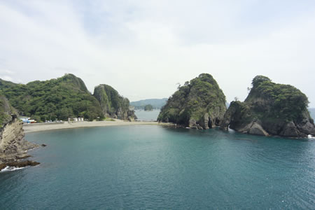 少し足を運んだところに「三四郎島」(県指定天然記念物)があります。干潮時になると海の中から道が現れて陸とつながり、